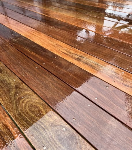 Le Cumaru, bois exotique reconnu pour sa grande résistance et sa longévité, est parfaitement adapté aux environnements extérieurs et aux zones humides comme les plages de piscine.
