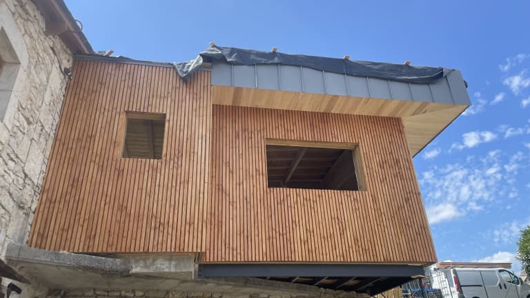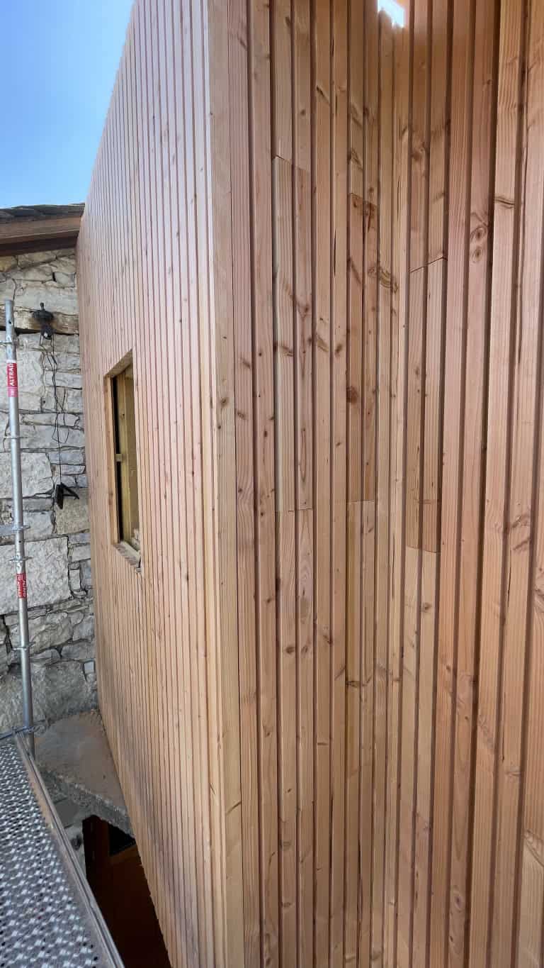 Le bardage sélectionné est le modèle Vibrato de la marque Vivre en Bois. Il s’agit d’un bardage en bois massif au design épuré, avec un système d’emboîtement par rainure qui permet d’obtenir une finition soignée, sans fixations apparentes. Cette solution offre également une mise en œuvre optimisée et un rendu visuel haut de gamme.